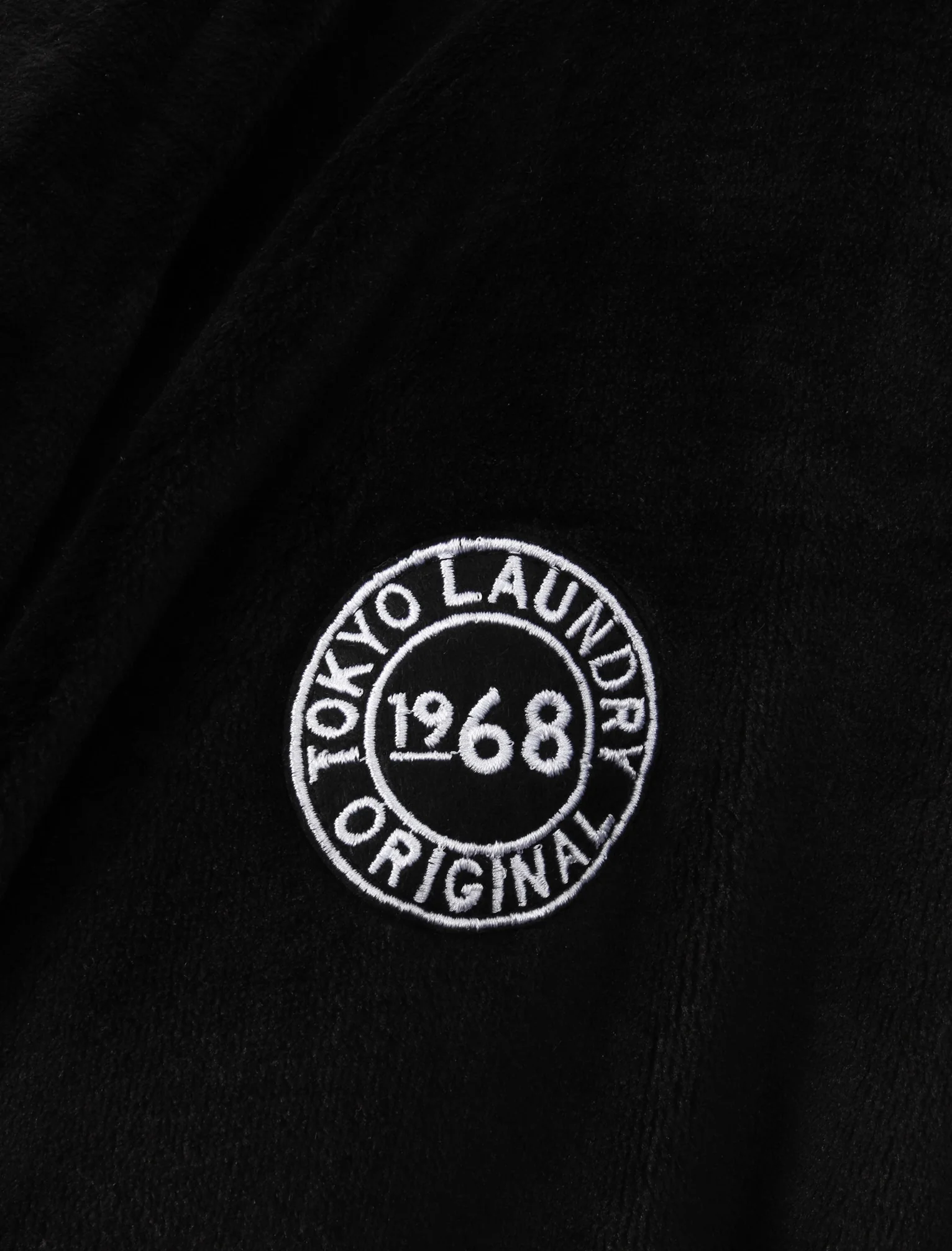 Wrap up cosy and warm in our ‘Alps’ soft fleece dressing gown with tie belt in Black by Tokyo Laundry. It’s classic design for timeless style features a shawl collar, wrap over opening with tie belt and two ultra-convenient pockets to the front. It’s made in a super soft to touch fleece to give exceptional warmth and comfort for those cold mornings. The branded felt patch to the left hand chest finishes this gown off and gives it our statement look. Pair with one of our checked lounge sets with comfy fleece lined slippers to complete your wind down attire.