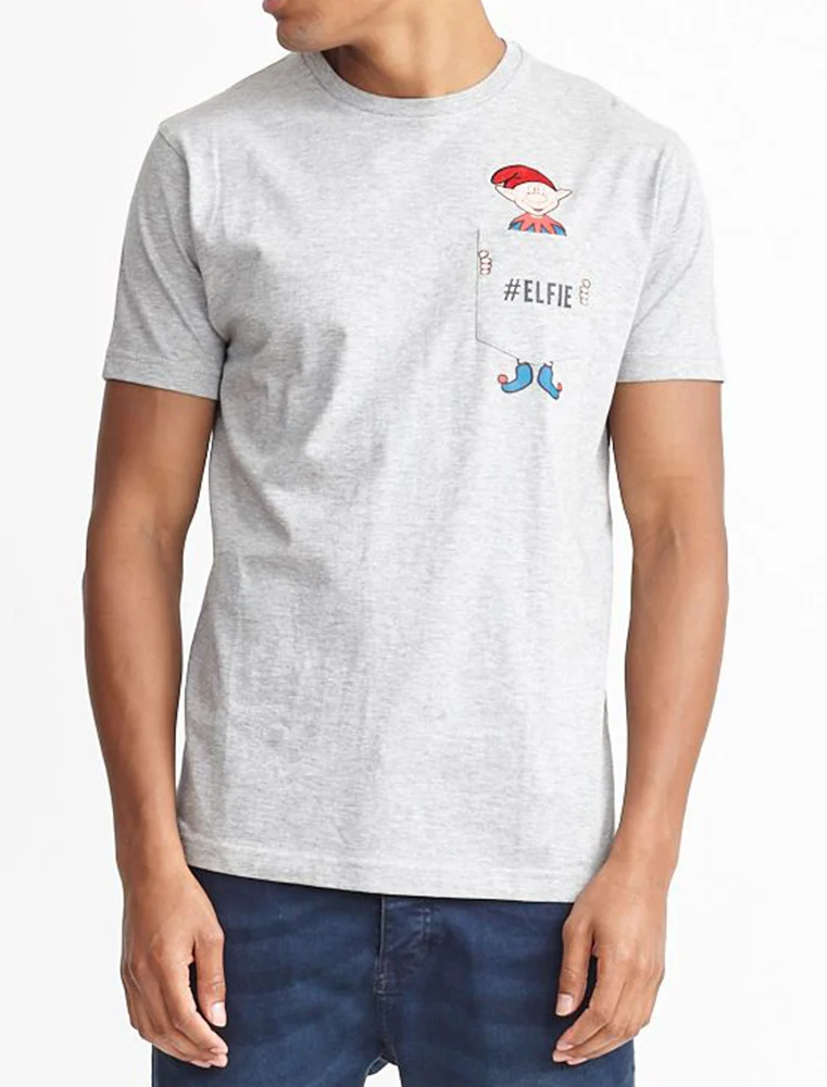 Elfie Novelty Christmas T-Shirt with Chest Pocket In Light Grey Marl