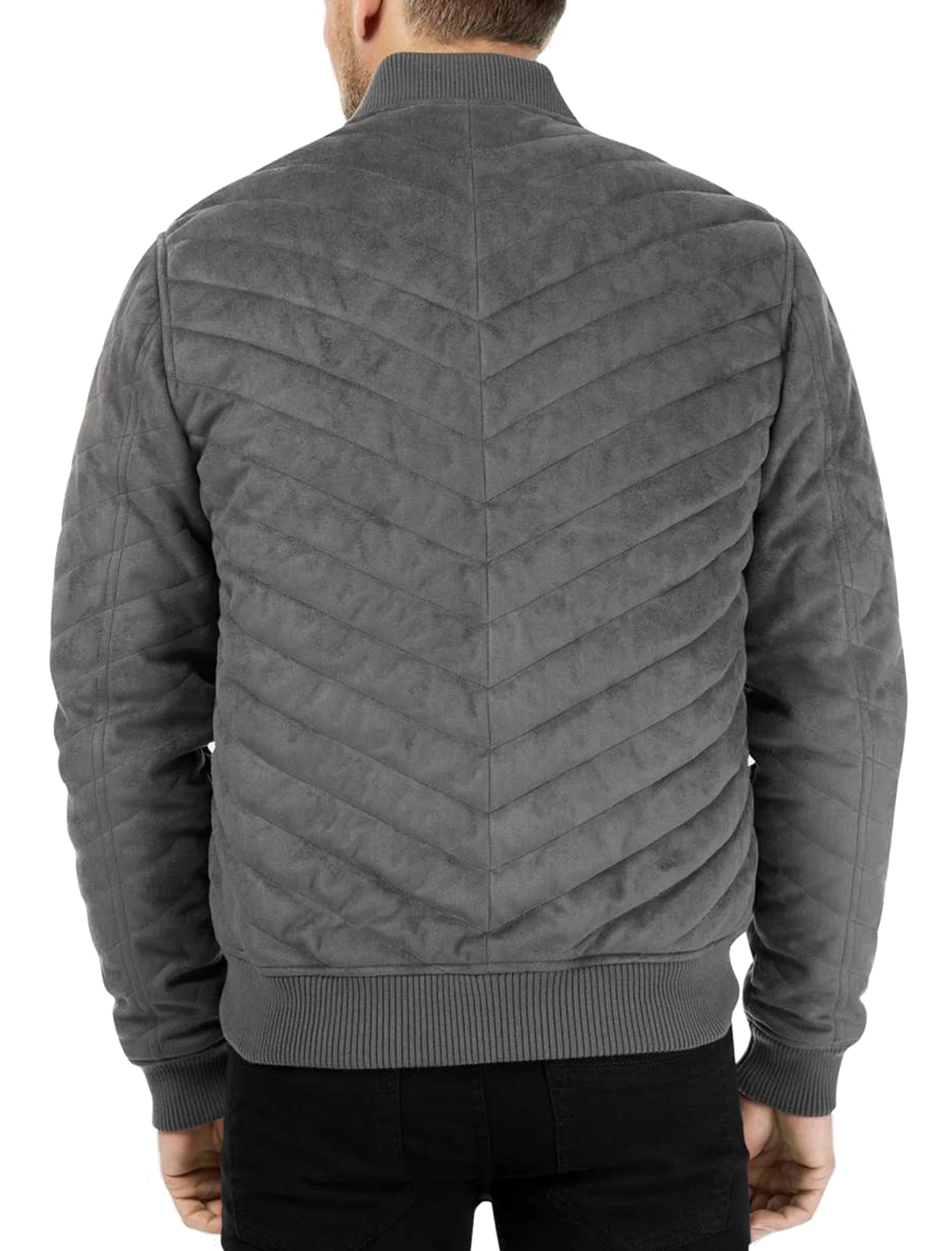 Make suede your investment piece for the A/W season with the ‘Myers’ quilted suede bomber jacket in grey. This luxury feel outer gives this outerwear jacket texture and sophistication, and has the chevron quilted design all over for added interest. The classic bomber style shape is still evident in the ribbed collarless neckline, ribbed hem and cuffed sleeve. This zips up the front, with two side pockets with zipper fastening. The quilted lining also makes this ideal for the colder weather. Wear over a smart button down shirt, jeans and desert boots for a casual smart look.