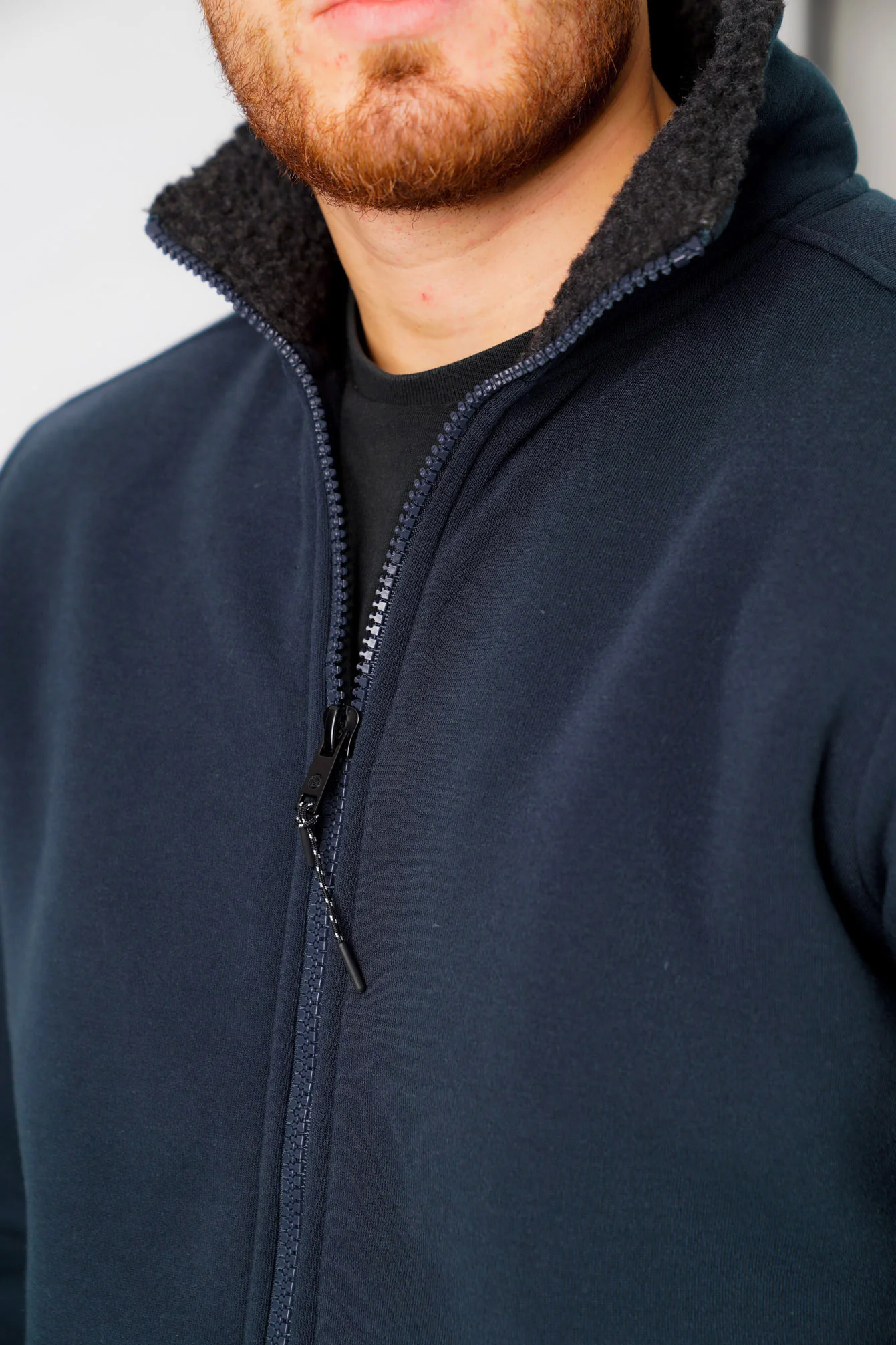 Percy Funnel Neck Zip Through Chunky Sweat With Borg Lining In Iris Navy - Dissident
