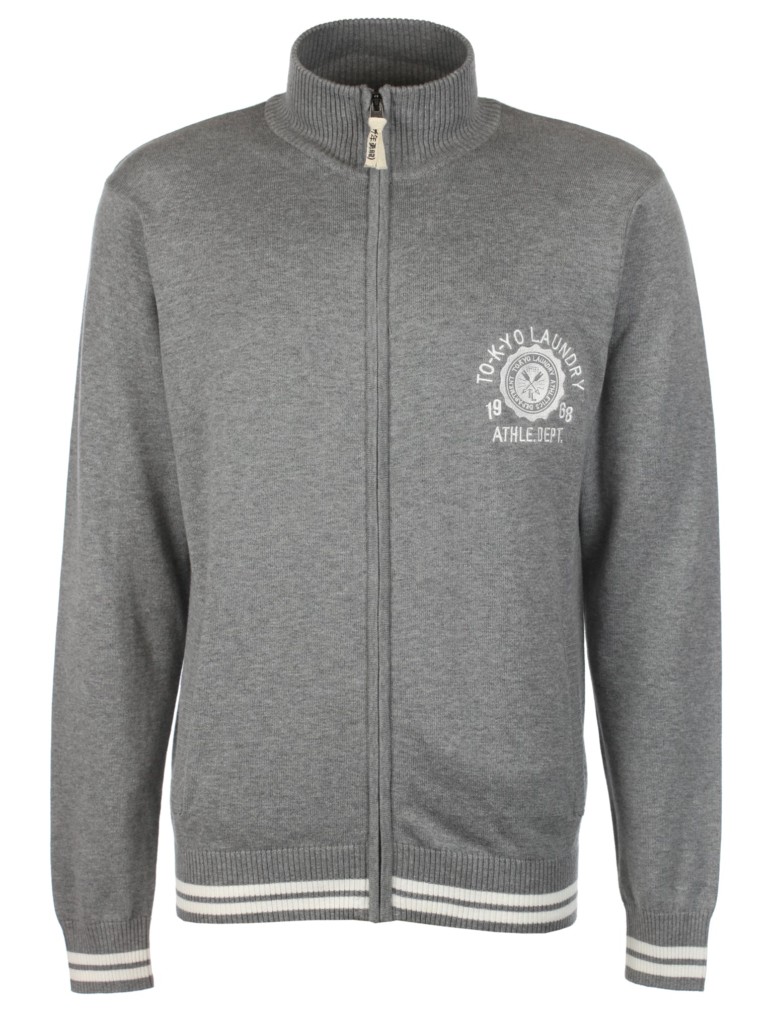 Tokyo Laundry ‘Coldwater’ ribbed neck cardigan constructed in a soft 100% cotton fabric. Featuring an embroidered chest patch, concealed zip fastening, ribbed hem and cuffs with contrast stripe detail and two slit side pockets. Wear open with a plain t-shirt and team with dark jeans and trainers for a weekend look.